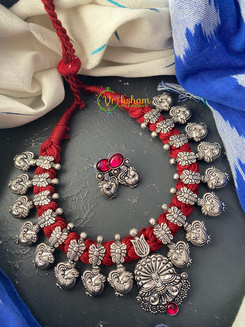 Red Thread Kolhapuri Silver Neckpiece (oxidized German silver) ;Handmade; Silver look alike jewelry ;one of a kind short neckpiece with adjustable black back rope/thread.