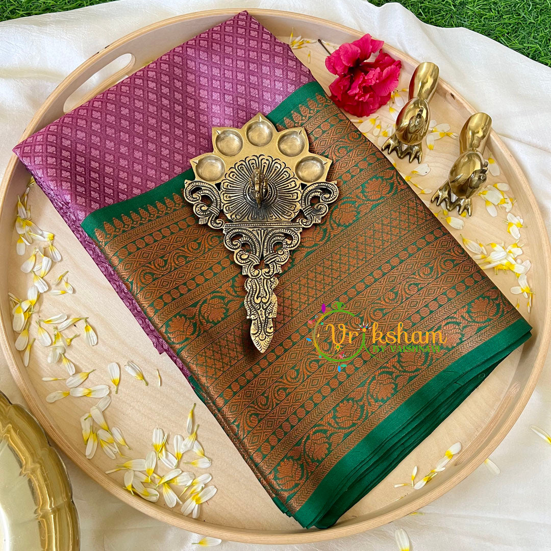 Purple with Green Kora Muslin Saree - Festive wear saree –work throughout the saree; comes with Blouse attached. Two side border and one side bigger border (Copper border).