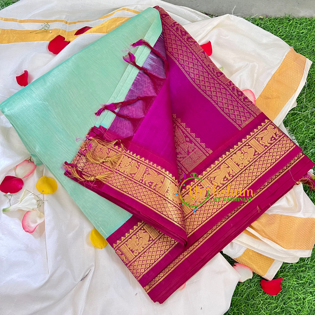 Aqua Green Korvai Handloom Silk Cotton Saree- Festive wear saree –Plain Pattern throughout the saree; comes with Blouse attached. Two side contrast border and pallu.