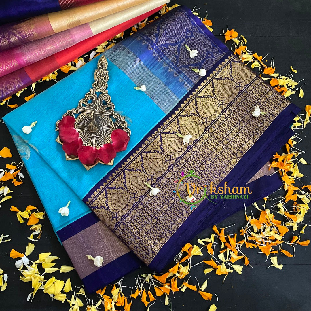 Sky Blue Korvai Handloom Silk Cotton Saree- Festive wear saree – Pattern throughout the saree; comes with Blouse attached. Two side contrast border and pallu.
