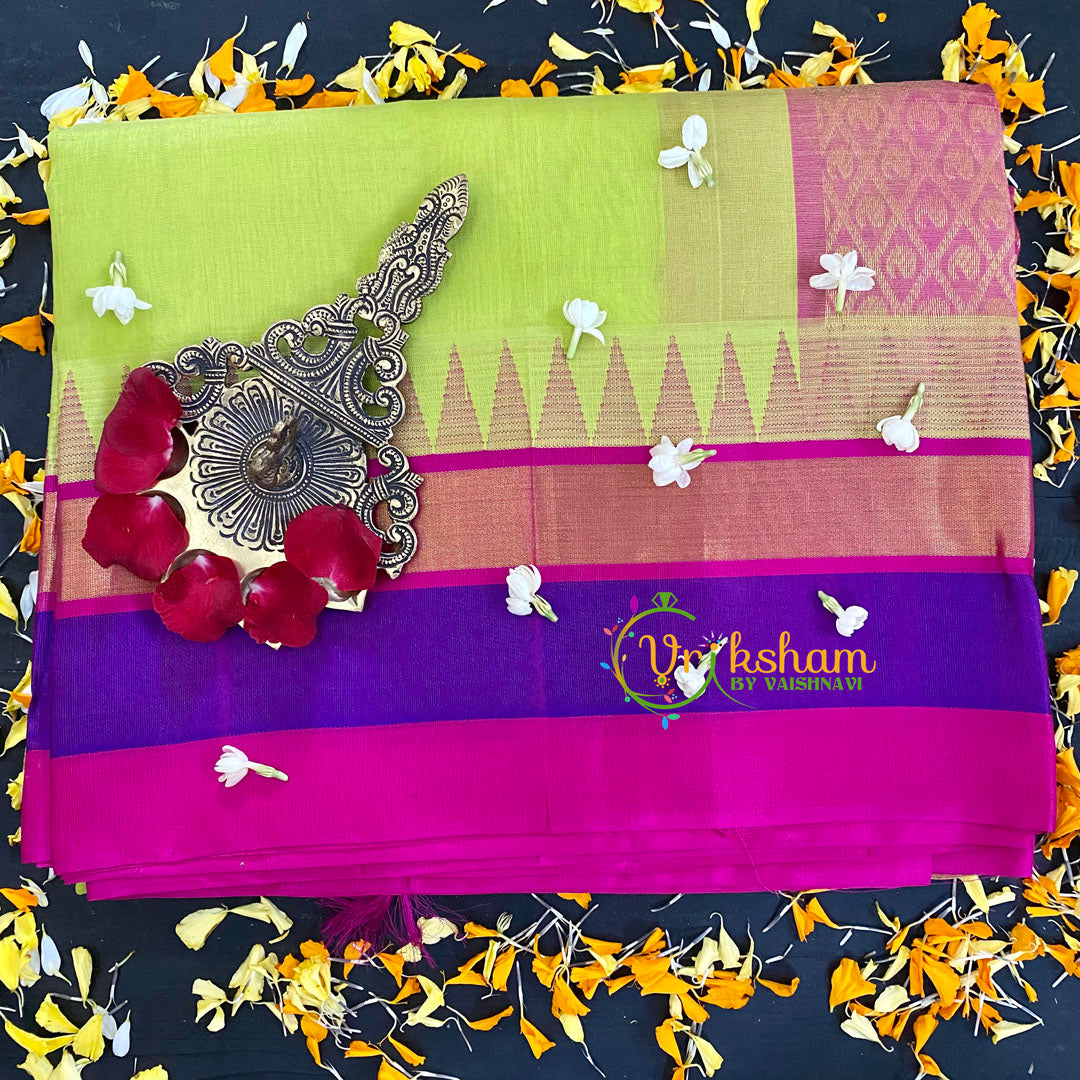 Fluorescent Green Korvai Handloom Silk Cotton Saree.- Festive wear saree – Pattern throughout the saree; comes with Blouse attached. Two side contrast border and pallu.