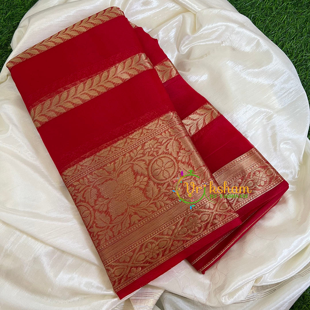 Kumkum Red Organza Silk Saree -Organza Kota Silk- Veldhari like pattern throughout the saree; comes with Blouse attached. Copper zari traditional border and pallu.