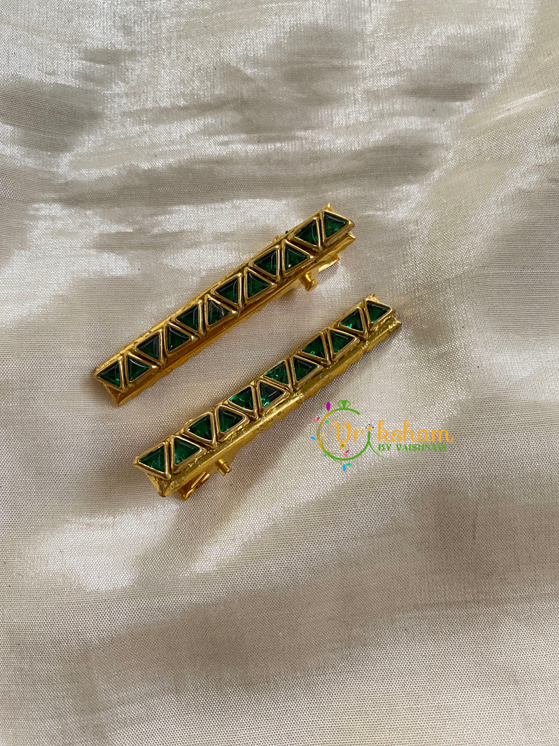 Kundan Hair Clip Green Triangle - Hair Clip- Pair of Kundan hair clips. Both adults and Kids wearable.