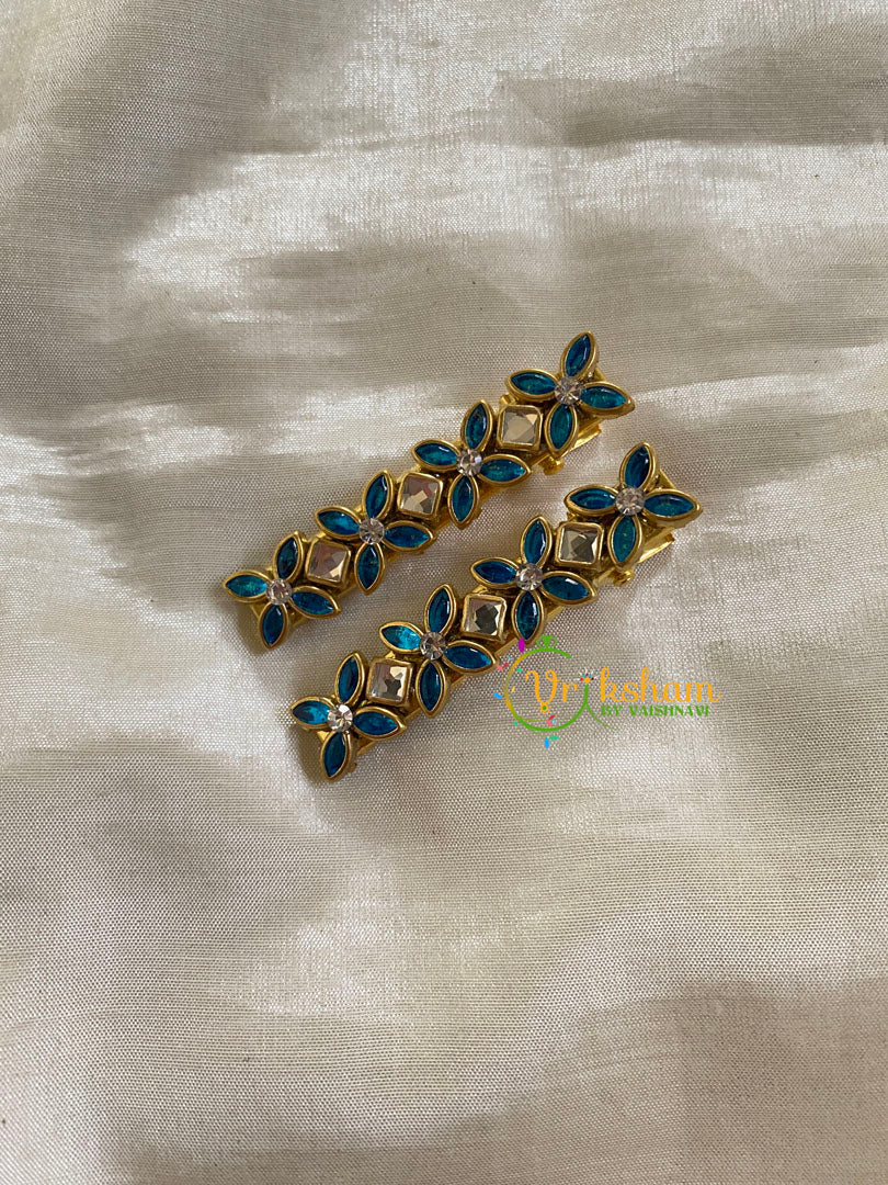 Kundan Hair Clip-gold-Light Blue-Flower Hair Clip- Pair of Kundan hair clips. Both adults and Kids wearable.