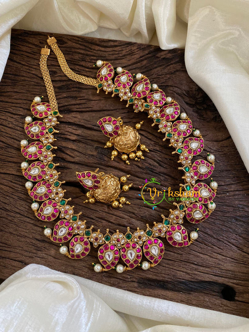 Exquisite Kundan Jadau Maanga Neckpiece – Premium quality antique geru polish precious kundan jadau work; paisley pattern neckpiece; Comes with matching jhumkas.