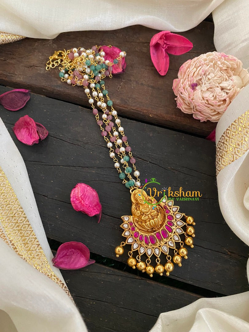 Precious Kundan Jadau Pendant bead Mala- Lakshmi Neckpiece with Golden bead finish is one of our highest quality jewellery; handmade by artisans; this boasts the design and quality of a real silver (but not silver) but at an afforable price.