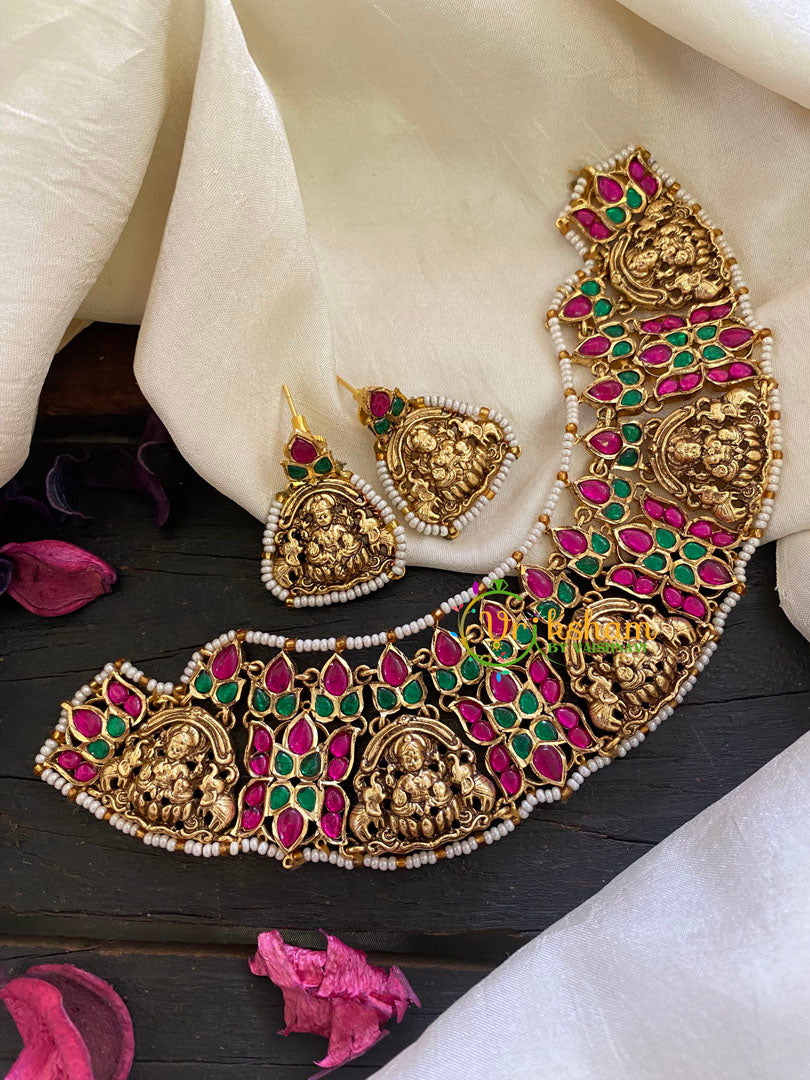 Precious Jadau Kundan Lakshmi High Neck Choker with exquisite kundan stones, Lakshmi idol and pearl arrangement.