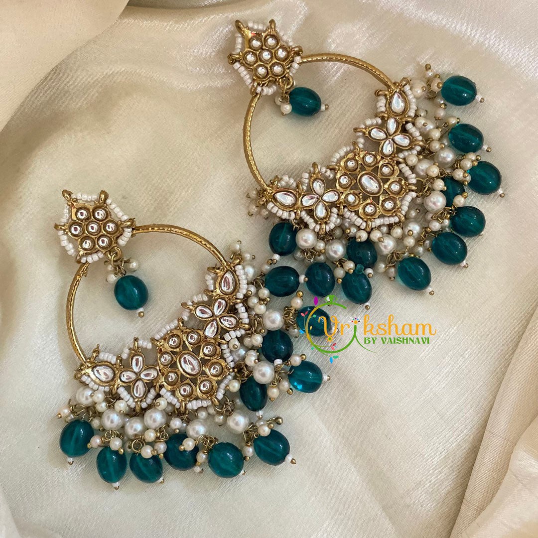 Green Bead Kundan Meenakari Danglers with centre stone and white kundan stone studded earrings; pearl and bead finish.
