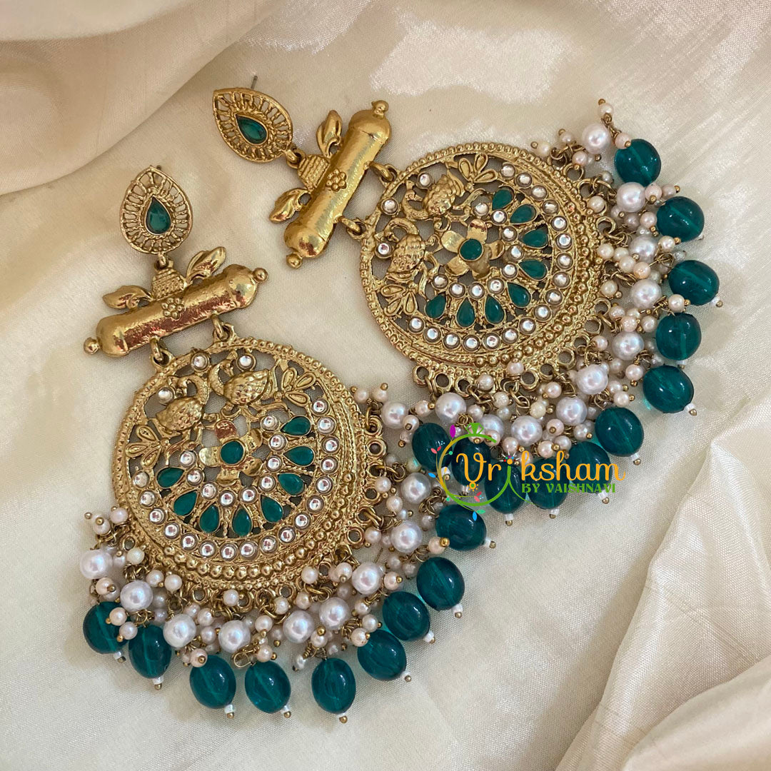 Green Bead Kundan Meenakari Danglers with centre stone and white kundan stone studded earrings; pearl and bead finish.