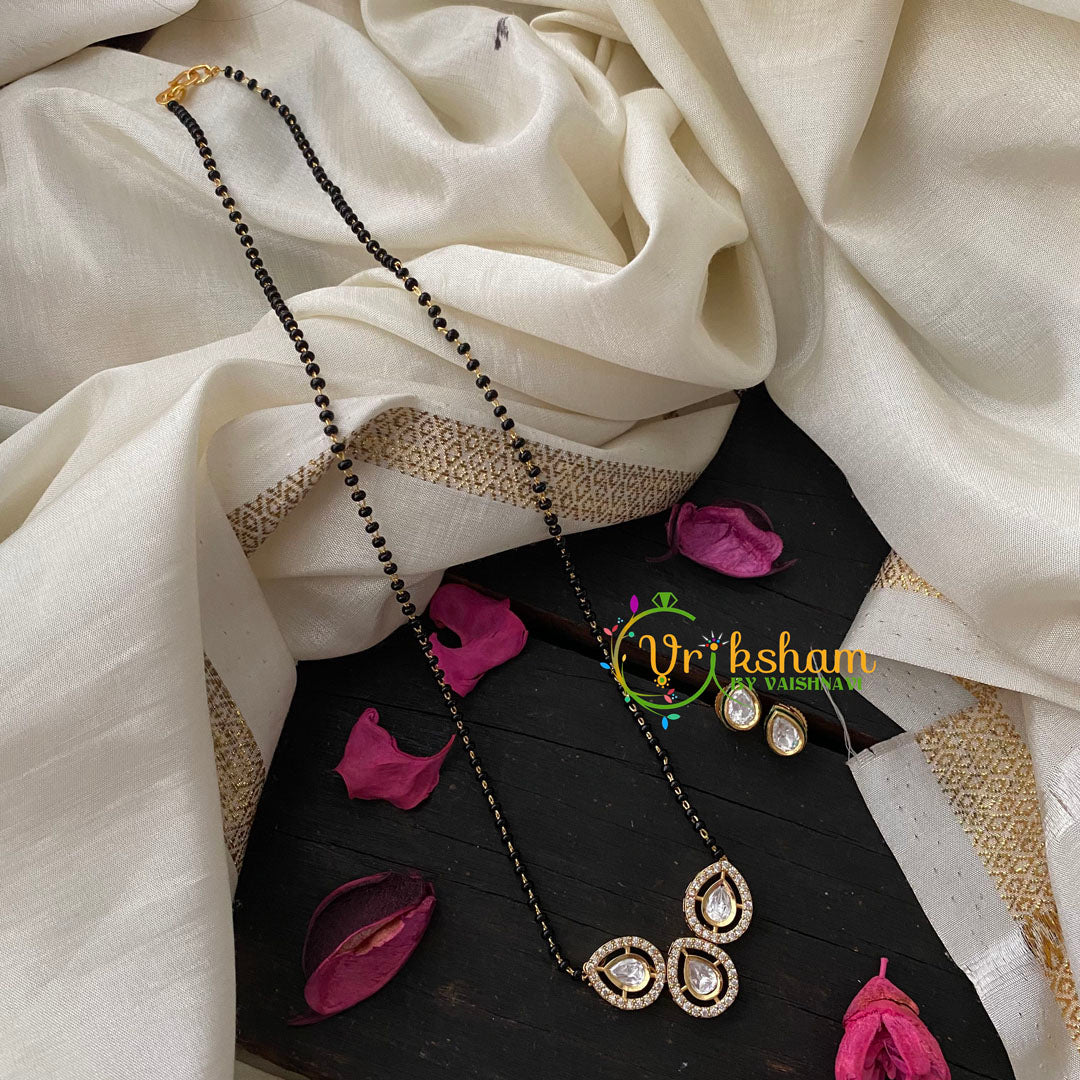 AD Stone Kundan Pendant Mangalsutra Chain-3 leaves-Kundan pendant; comes with matching ear studs. Gold Look alike polish.
