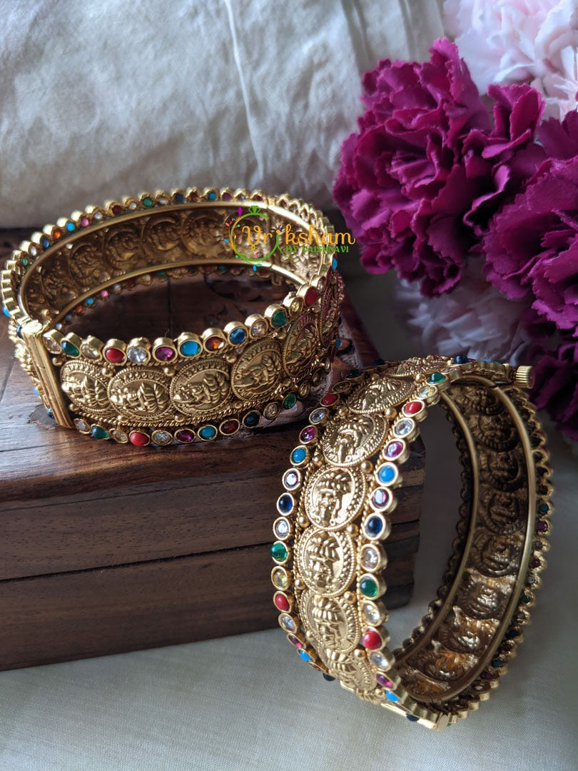 Lakshmi Bangles -Temple Bangles - Screw Type -Multicolor imitation stone studded along the outer end of the bangle – 2 bangle –premium bangle with Lakshmi designed pattern imitation stone bangle.
