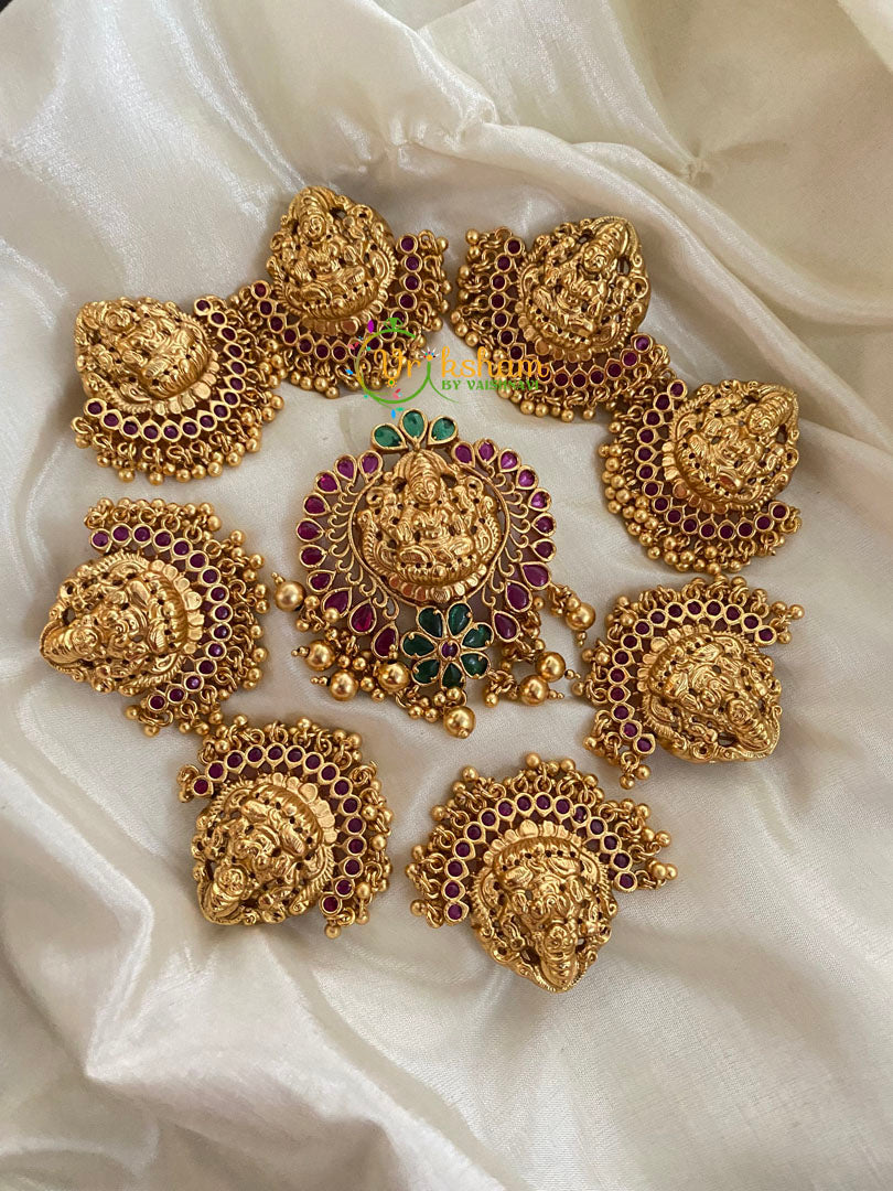 AD stone Lakshmi Billai -Temple Jada Billai -9 pieces of same size temple billai – Lakshmi with ad stones, comes together as 9 pieces only. Pearl Finish. Predominantly red and little green.