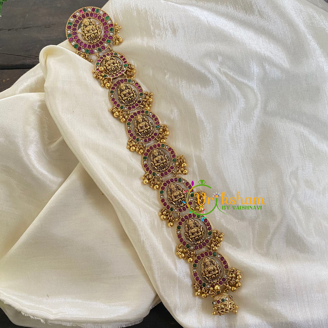 AD stone Lakshmi Billai -Temple Jada Billai -9 pieces of same size temple billai – Lakshmi with ad stones, comes together as 9 pieces only. Ghungroo Finish.