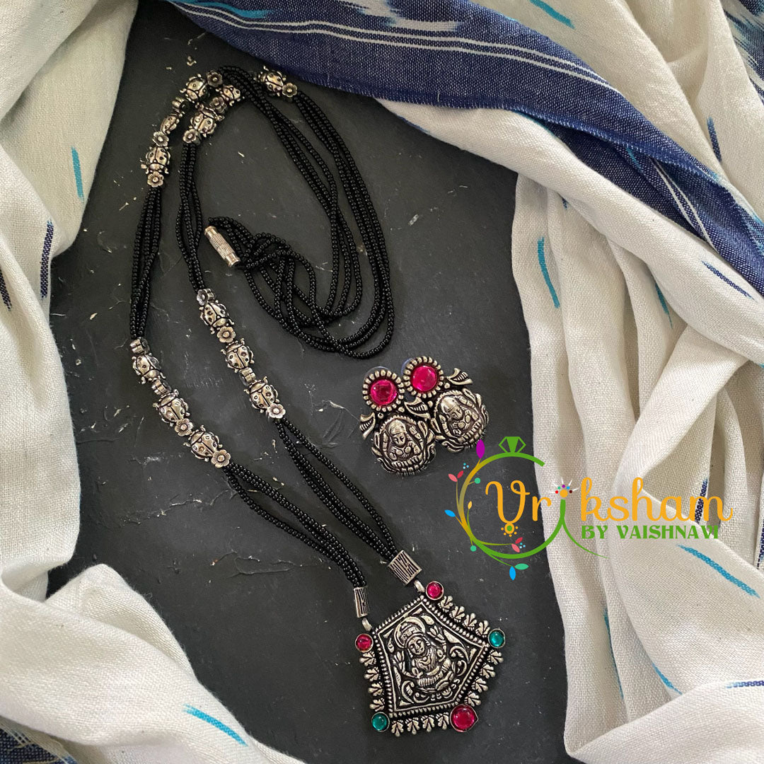 Lakshmi Pendant Black Bead Chain– Oxidized Kolhapuri pendant neckpiece; black bead chain with german silver beads