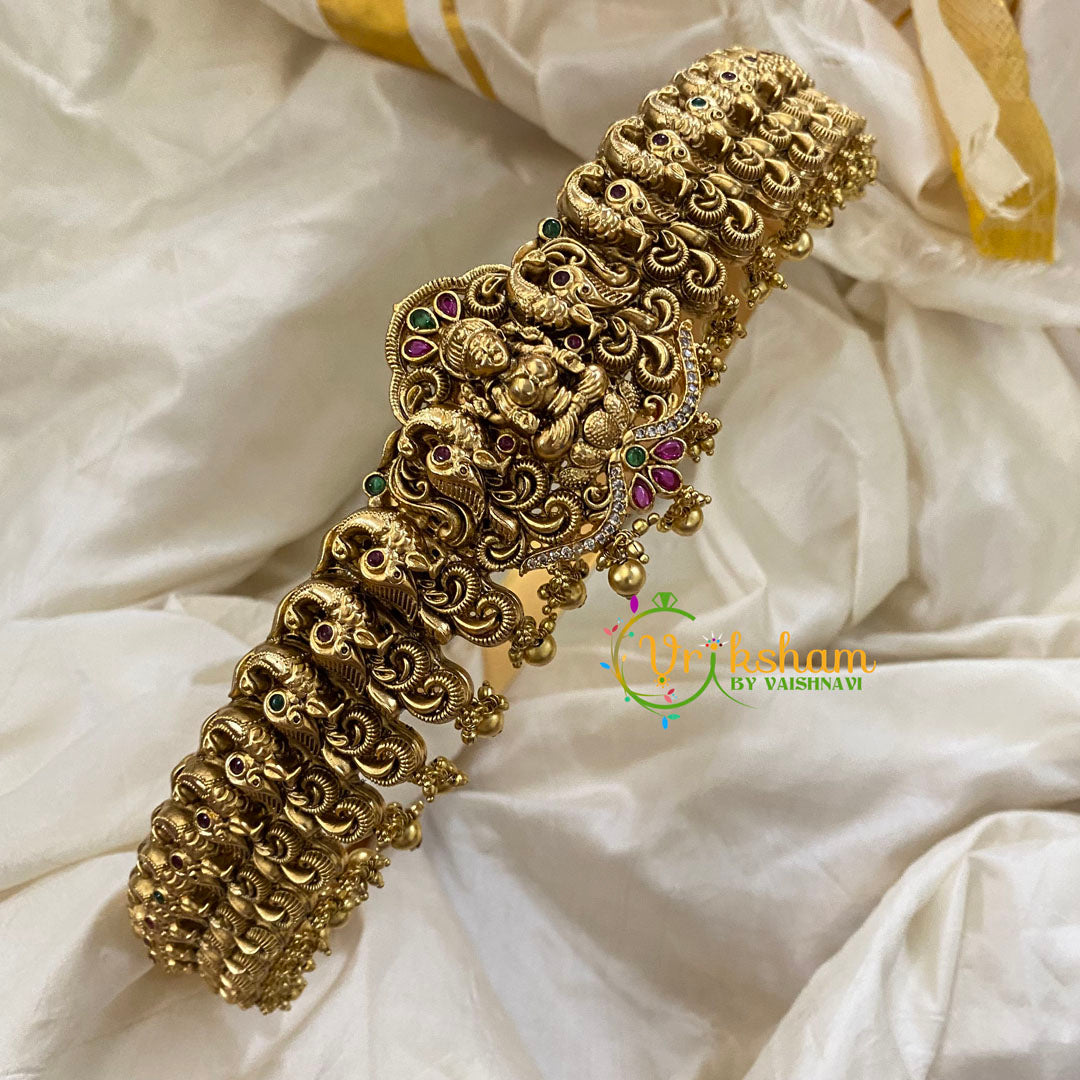 Premium Lakshmi Bridal Temple Hipbelt with green and red imitation stone and peacock pattern. Gold Bead finish.