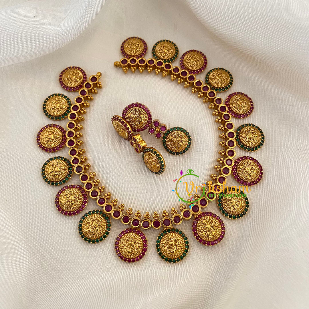 Lakshmi Coin Choker Short Neckpiece-Red Green - coin style temple neckpiece. Pearl finish; comes with matching earrings.