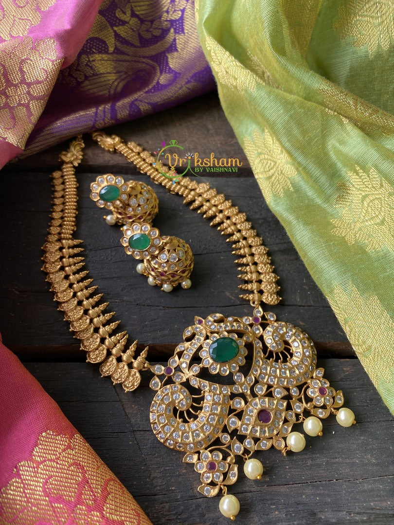 Unique Lakshmi coin CZ stone Peacock Neckpiece -Gold look finish, Matt Lakshmi coin along the length and peacock pendant with flower pattern, centre green stone and red stone, pearl finish, comes with pair of CZ stone jhumkas.