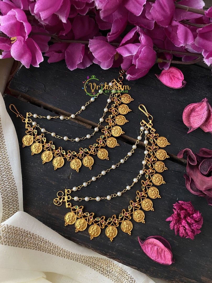 Lakshmi Coin Maatil with two layered pearl – 3 layer Maatil -Red and green stone studded matt finish ear chain.