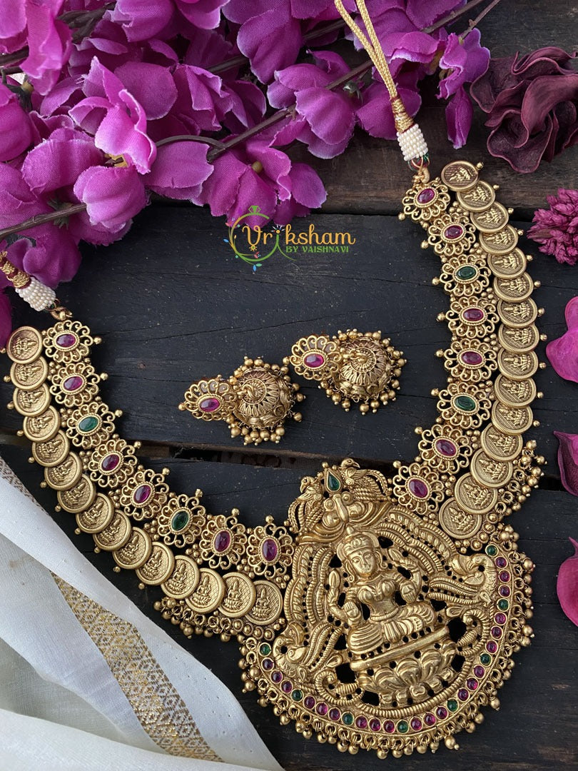Lakshmi coin and Pendant Choker -Temple Neckpiece -Predominantly Red stone along the pendant and length of the neckpiece and Green stone studded lakshmi choker Ghungroo Finish, comes with matching jhumkas.