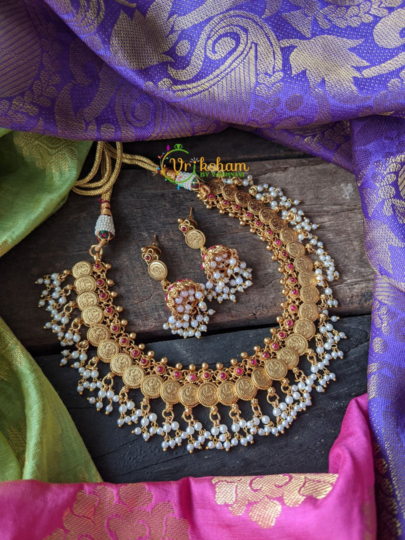 Lakshmi coin Temple Neckpiece - premium quality short neckpiece with red stones studded to the upper layer and cluster pearl finish in the bottom layer, comes with kaasu/coin stud jhumkas.
