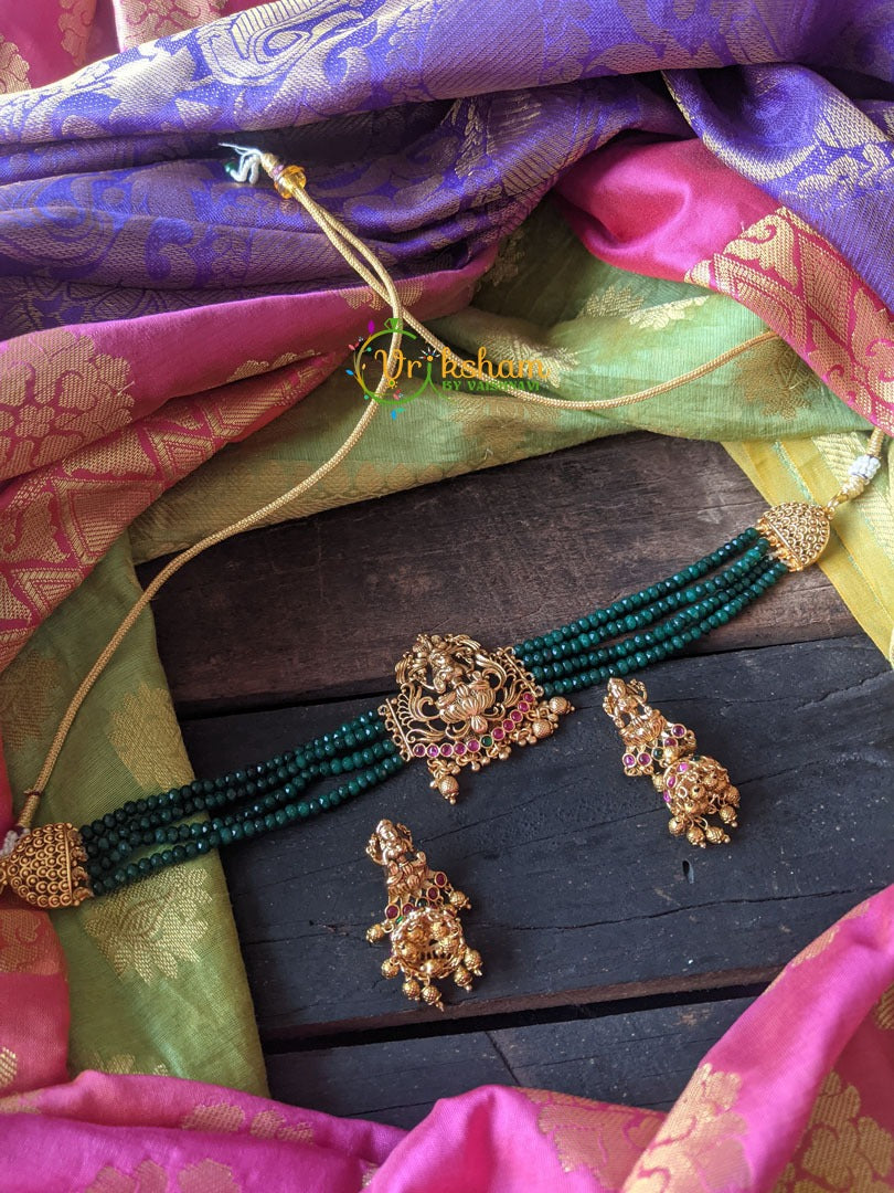 Lakshmi Green Bead High Neck Choker - 4 layered pearl with lakshmi pendant -red green stone studded, comes with with Jhumkas.