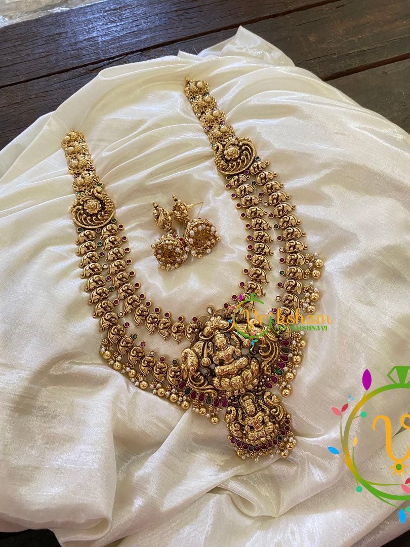 Premium AD Stone Lakshmi Haram with Mogappu - Gold Bead Finish- Premium quality long neckpiece - Red White and Green stones, comes with similar matching ear hangings.