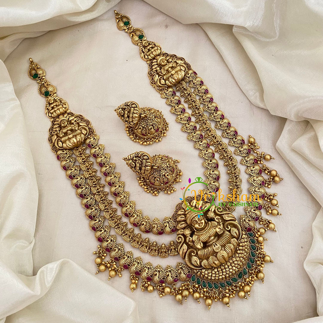 Premium Layered Lakshmi Haram with Mugappu-Red green stones and Gold Bead Finish -Intricately Designed Temple Neckpiece, with lakshmi pendants and Mogappu comes with matching ear hangings.