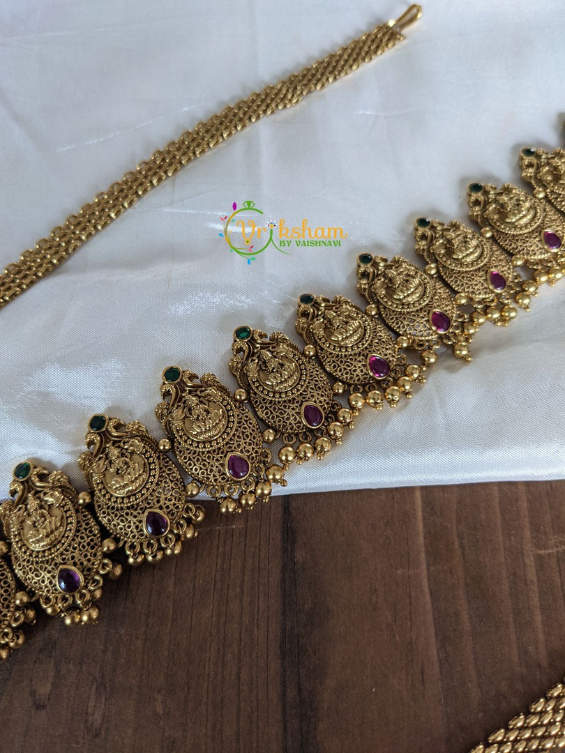 Antique Lakshmi Hip Chain -Temple Hipbelt – Gold look alike with Kemp stone studded series of lakshmi idol arranged linearly.