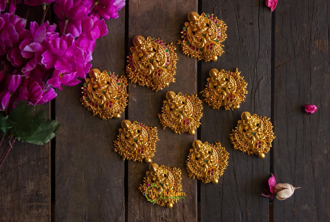MAKE MATERIAL – This beautifulLakshmi Jada billai with golden beads is made of copper and brass and Kemp stones.