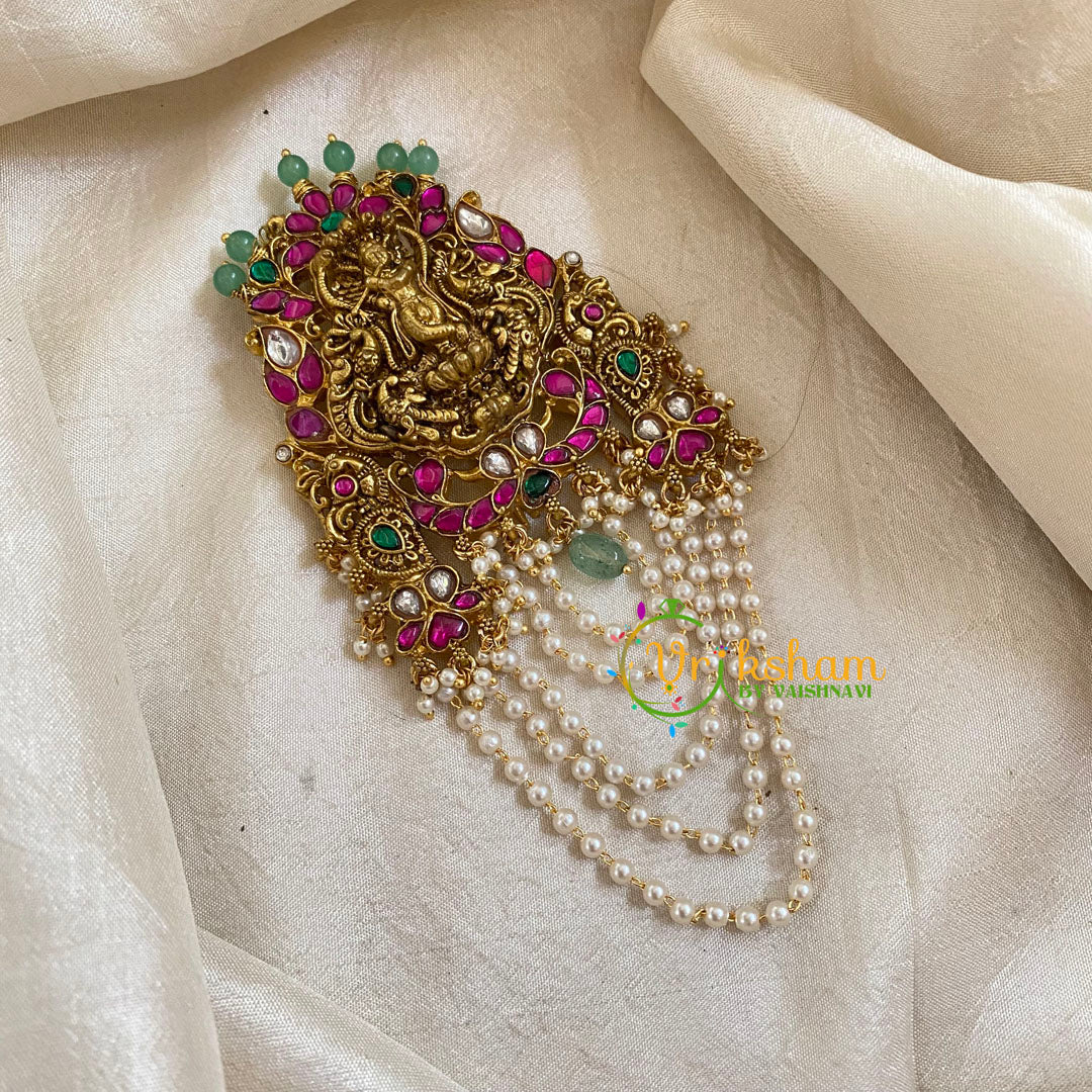 Precious Jadau Kundan Lakshmi Jada Billai with Pearls hanging in layeres -single bun billai - bridal hair accessory; Pearl finish.