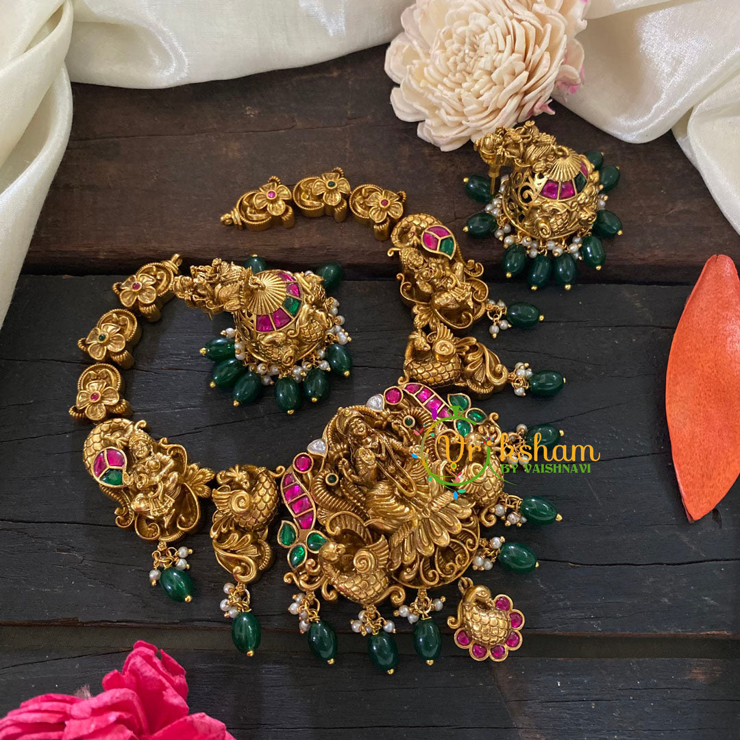 Lakshmi Jadau Kundan Short Neckpiece- Premium quality geru polish with precious kundan work. Green Bead finish.