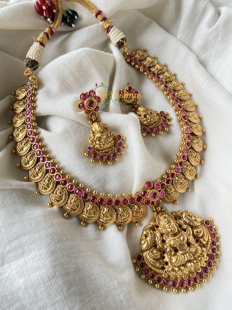 Lakshmi Kaasu/Coin Neckpiece -Temple Jewel -Gold look alike, Lakshmi main pendant with kemps stone arrangement. Comes with pair of Lakshmi ear hangings.