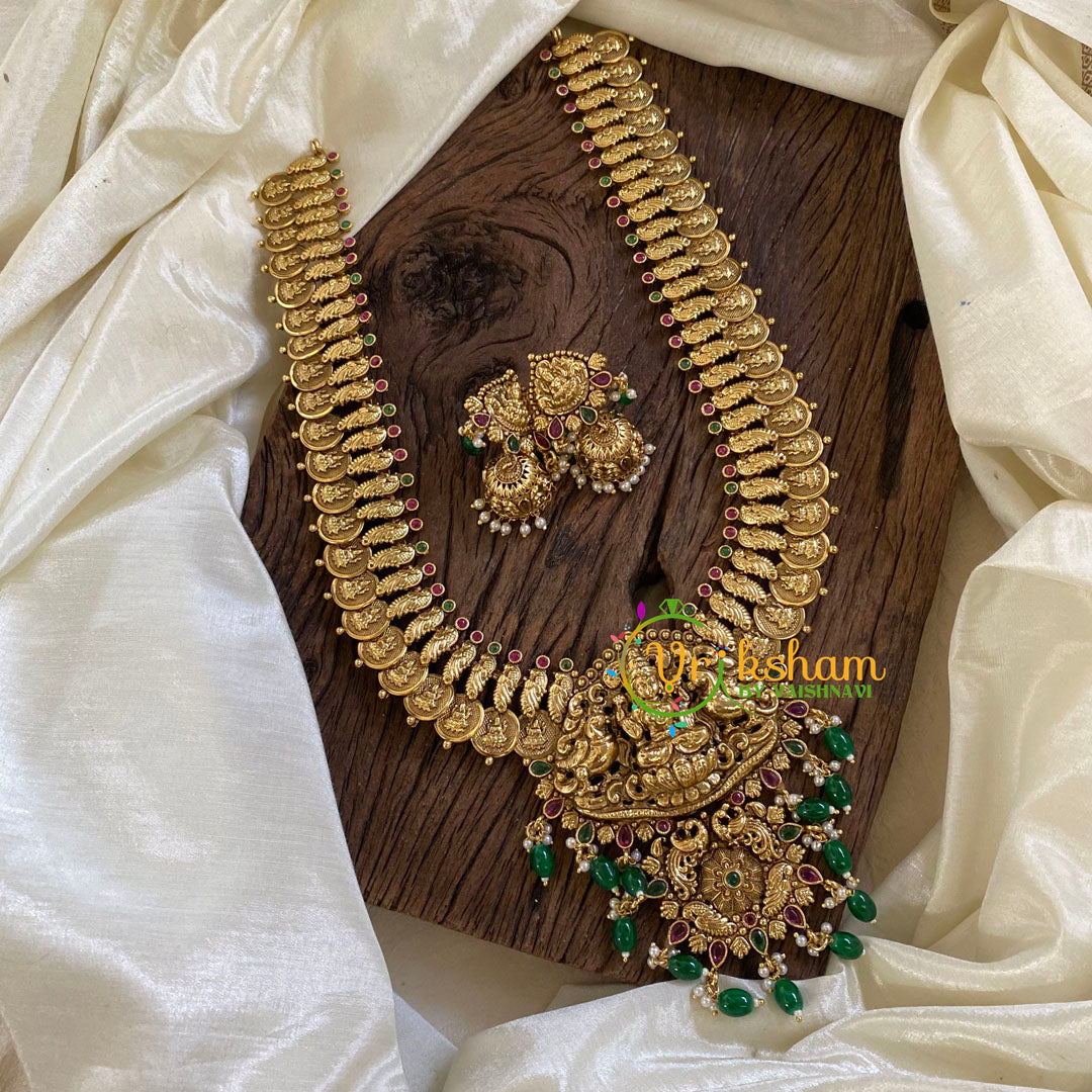 Premium Antique Temple Haram - Lakshmi Kaasumala-Green Bead-Intricately Designed Temple Neckpiece ad stone ; lakshmi pendant; comes with matching ear earrings.