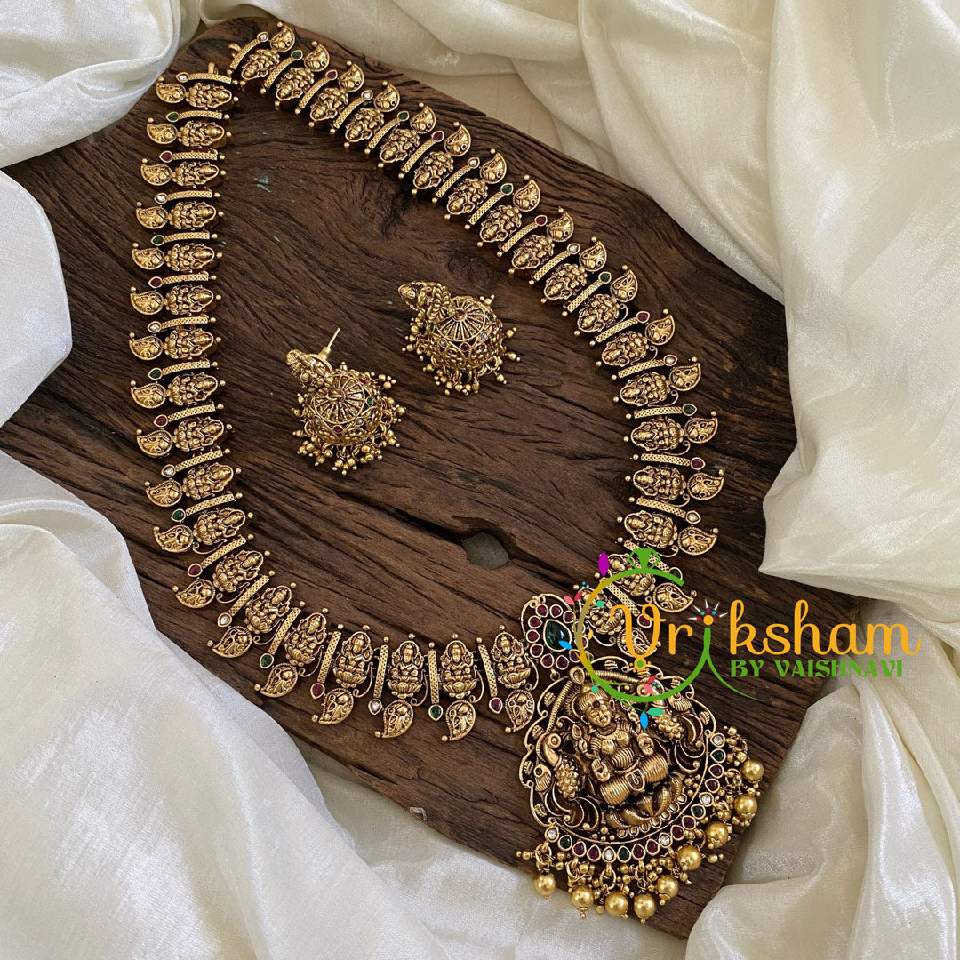 Premium Antique Temple Haram - Lakshmi Maanga Haram -Gold Bead-Intricately Designed Temple Neckpiece ad stone ; lakshmi pendant; comes with matching ear earrings.