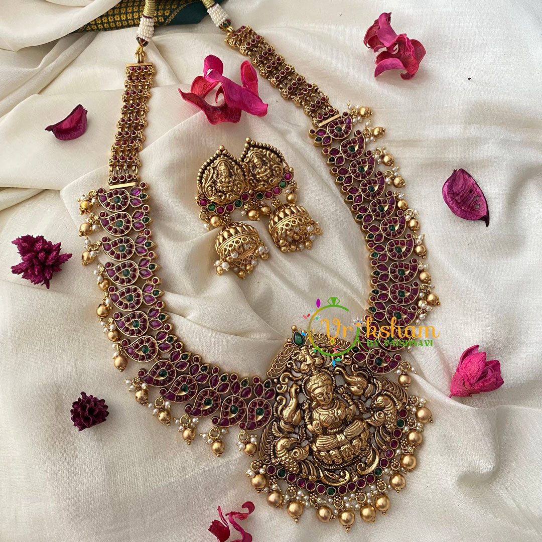 Premium AD Stone Lakshmi Maanga Haram-Paisley pattern and upper layer in linear fashion from half way with Lakshmi Pendant, comes with earrings. Gold Bead Finish.