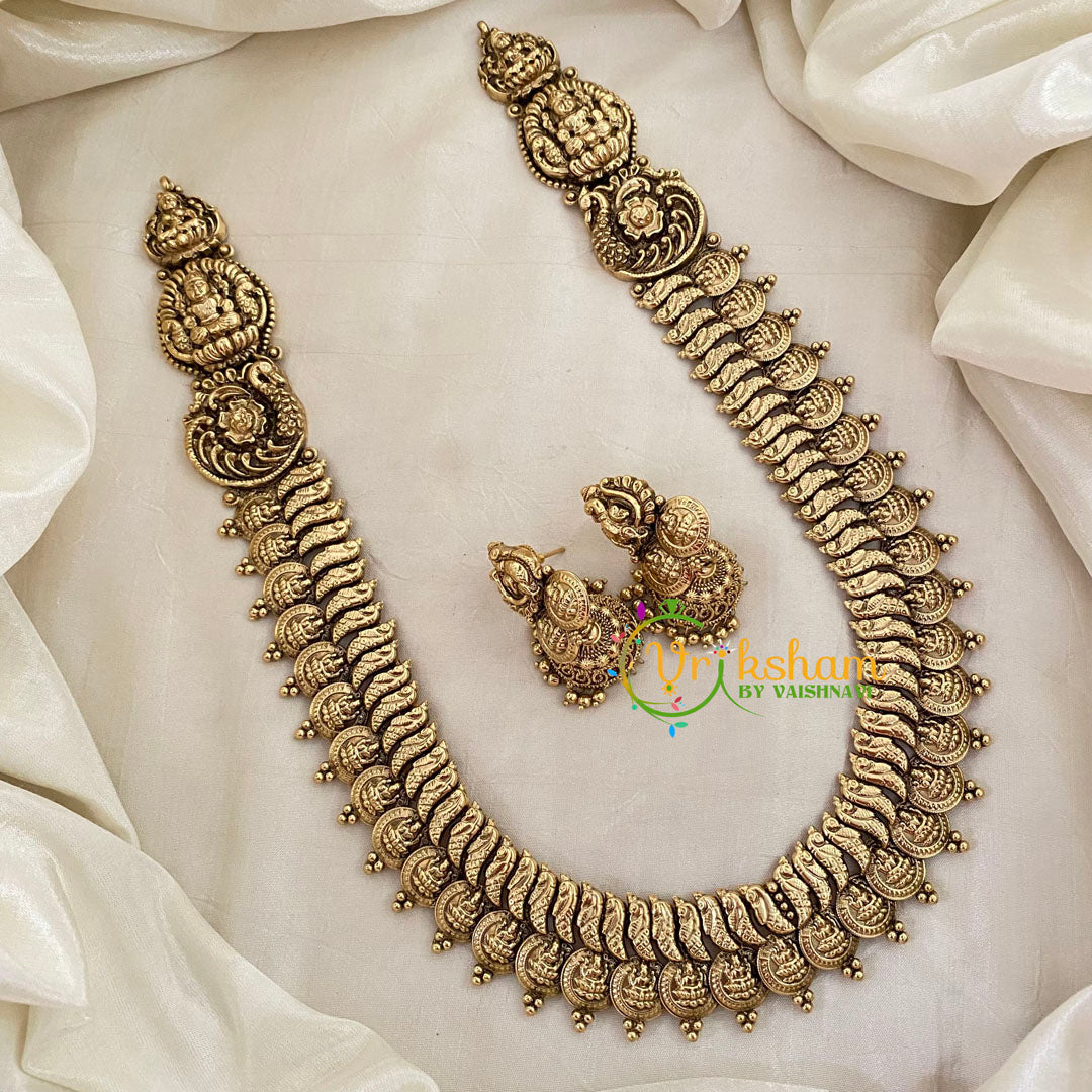 Lakshmi Mogappu Kaasumalai Haram -Temple Haram -Gold Look Alike Haram - Premium polish lakshmi coin kassumala along length of the neckpiece with lakshmi mugappu , comes with matching earrings.
