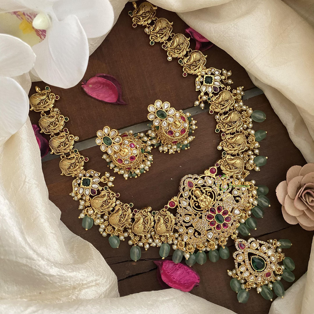 Introducing our Lakshmi Peacock AD Stone Neckpiece, featuring a vibrant aqua green bead. This stunning and exclusive piece is adorned with intricate peacock designs and sparkling AD stones, sure to elevate any outfit. Embrace luxury and sophistication with this statement necklace.