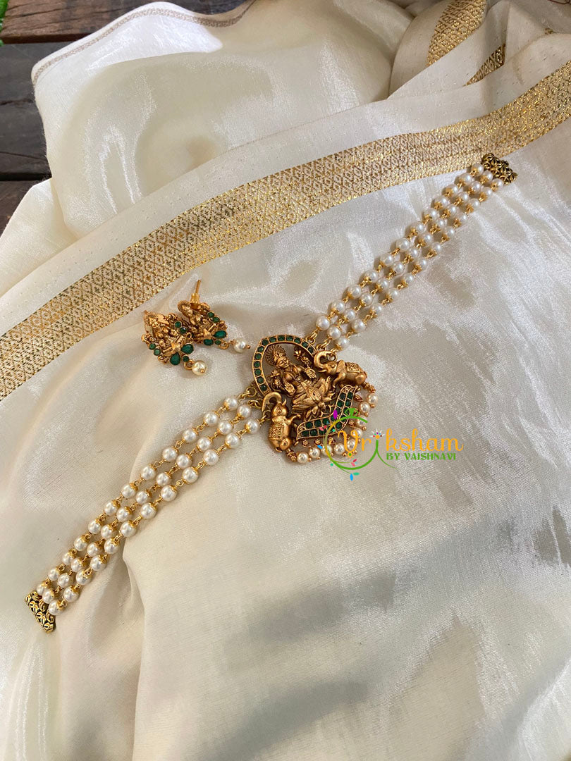 Lakshmi Pearl High Neck Choker- Green ad stone studded centre pendant- 3 layered pearl choker; comes with matching Earrings.