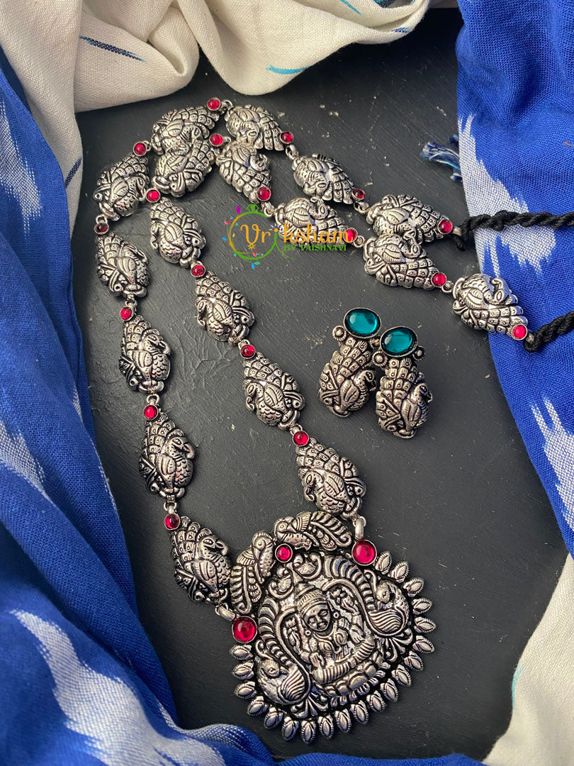 Lakshmi Pendant Oxidized Silver Temple Haram; peacock chain links, LAKSHMI Pendant; red stone studded. Comes with a pair of green stone peacock stud.