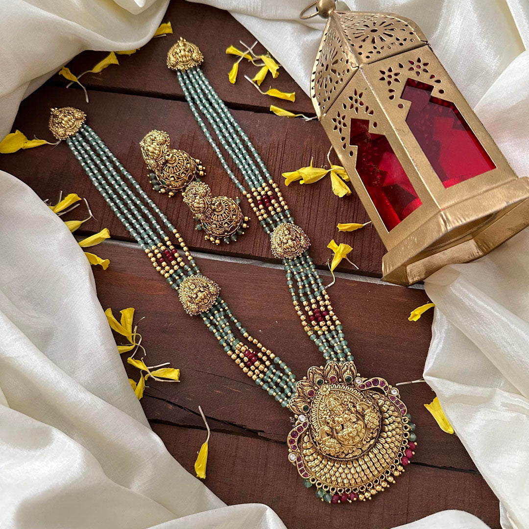 Embrace opulence with our Lakshmi Pendant Haram-Green & Red Bead. Adorned with exquisite green and red beads, this pendant evokes the beauty and blessings of Lakshmi, the Hindu goddess of wealth and prosperity. A statement piece that exudes elegance and sophistication. Elevate your style with this luxurious haram necklace.