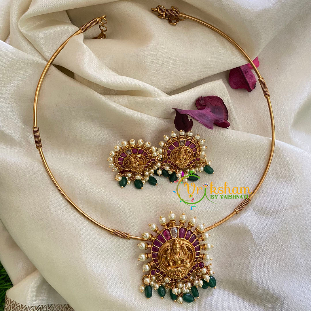 Premium AD Stone Lakshmi Pendant Hasli Choker-centre WHITE stone -Green Bead finish - premium quality AD Stone studded pendant hasli short neckpiece, comes with matching earrings.