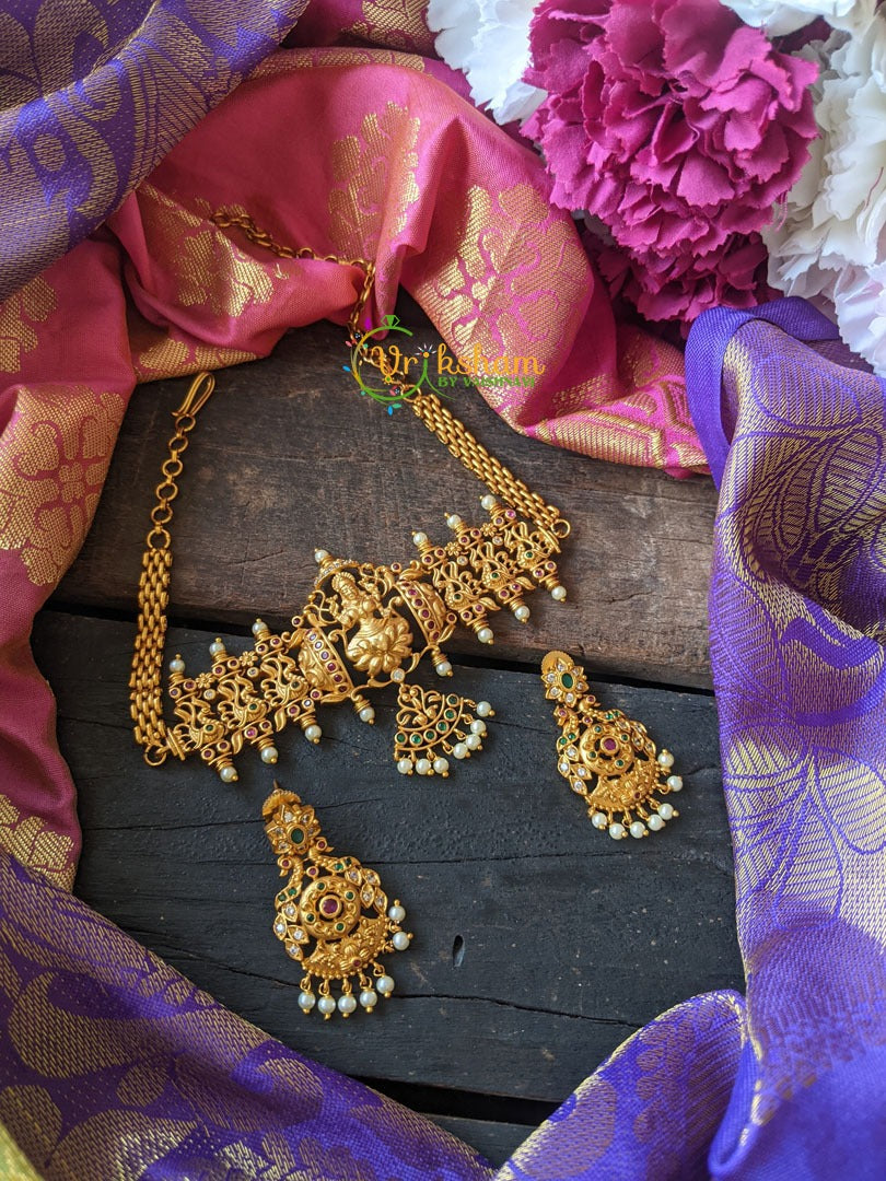 Lakshmi Pendant High Neck Choker - centre lakshmi with hanging pendant and peacocks on either side, comes with pair of matching earrings.