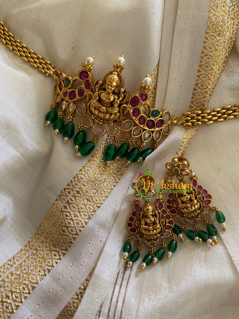 Premium Lakshmi Pendant High Neck Choker-Green Bead-Red Green kemp and white AD stone studded premium quality high neck choker; green bead finish . Comes with matching ear hangings.