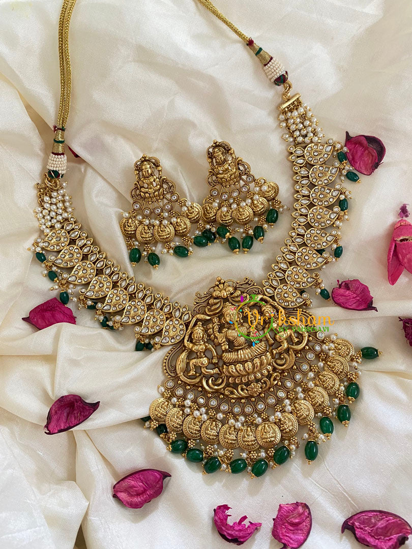 Traditional Lakshmi Pendant Maanga Neckpiece- Short Neckpice is an Elegant and Premium Quality white AD Stone short neckpiece; comes with earrings. Green Bead Finish.