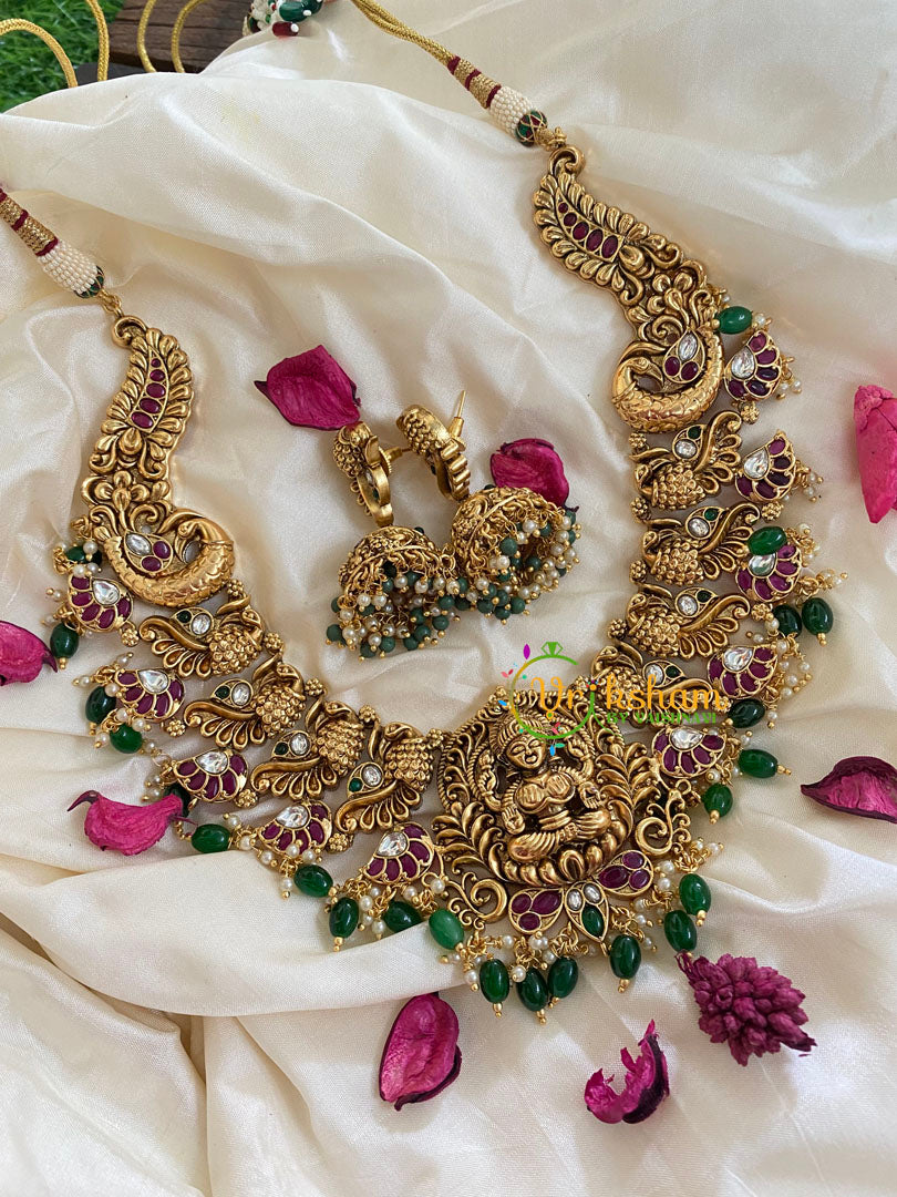 Traditional Lakshmi Pendant peacock Neckpiece- Short Neckpiece is an Elegant and Premium Quality red green white AD Stone short neckpiece; comes with earrings. Green Bead Finish.