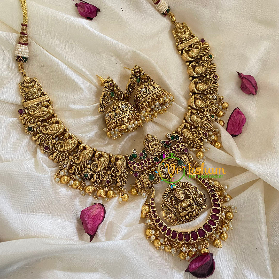 Traditional Lakshmi Pendant peacock Neckpiece- Short Neckpiece is an Elegant and Premium Quality red green white AD Stone short neckpiece; comes with earrings. Gold Bead Finish.