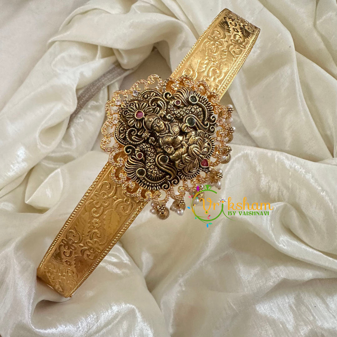 AD Stone Antique Lakshmi Pendant Plain Hipbelt in center; ad stone and semi precious studded hipbelt. MAKE MATERIAL – AD Stone Antique Lakshmi Pendant Plain Hipbelt is made of copper...