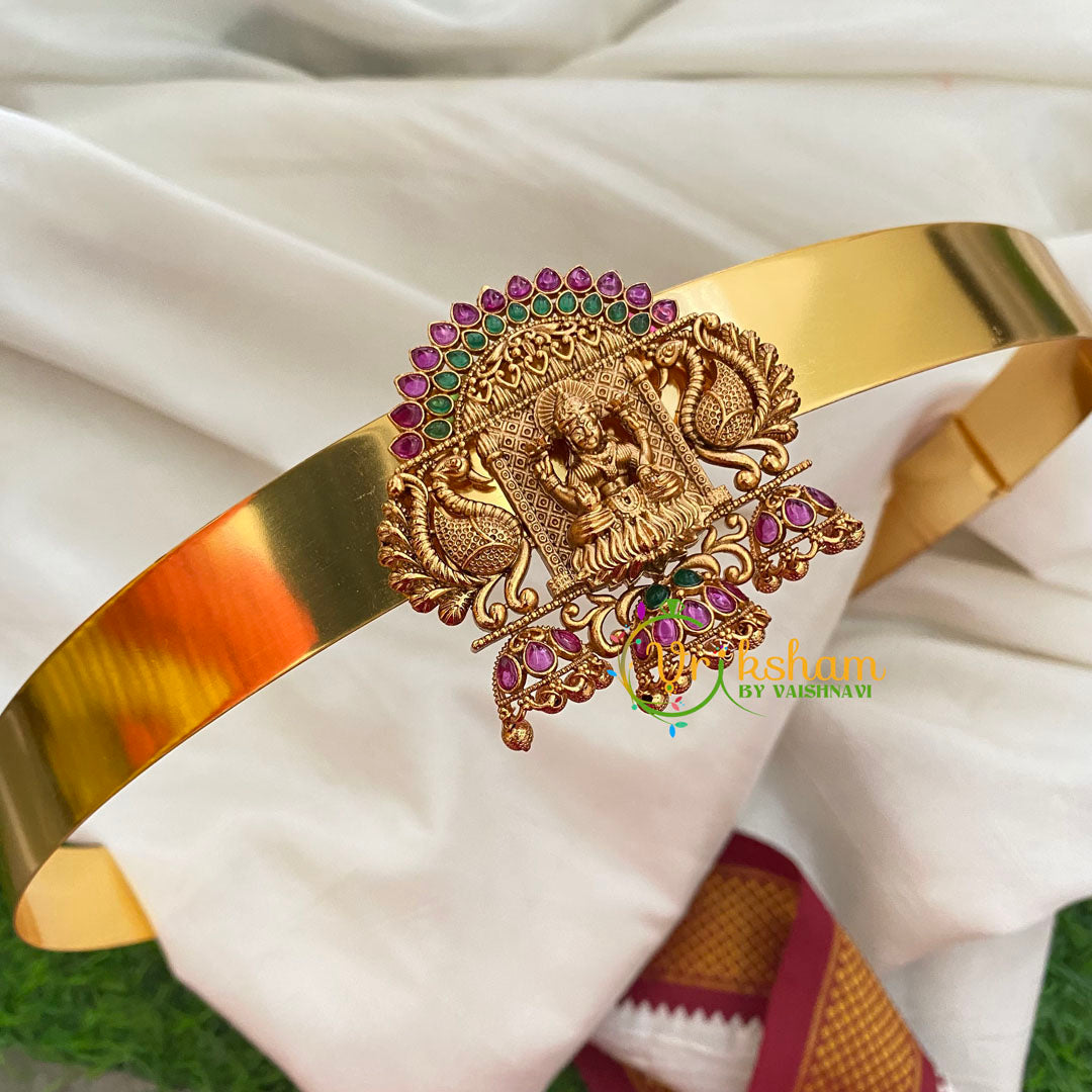 Exquisite Lakshmi Pendant Plain Hipbelt -Simple elegant Red Pink Green peacock either side design of centre piece on plain Hipbelt. Half Jhumka finish.