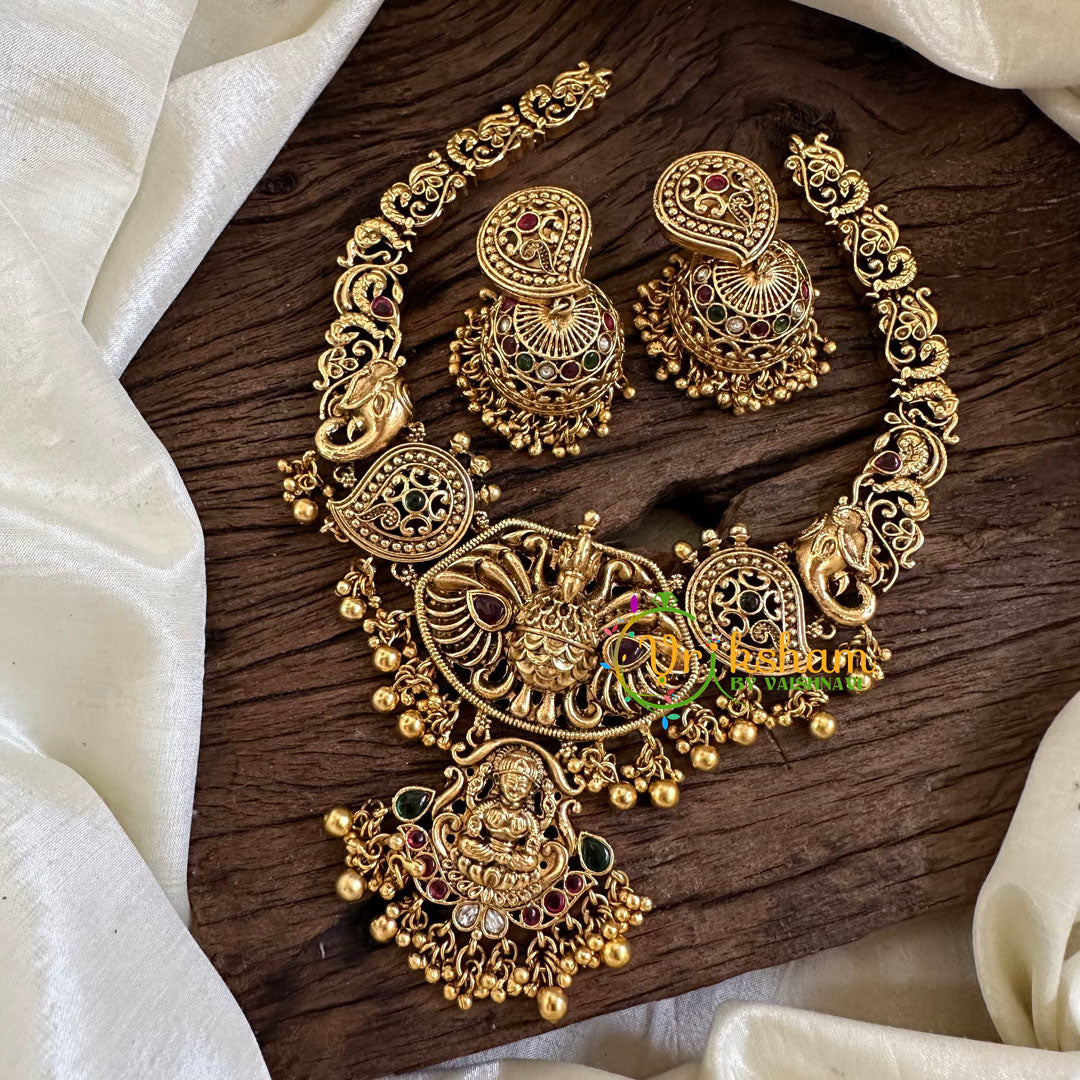 Gold Look Alike Lakshmi Pendant Short Neckpiece- premium quality polish and NO stones neckpiece, comes with matching earrings. G bead finish.