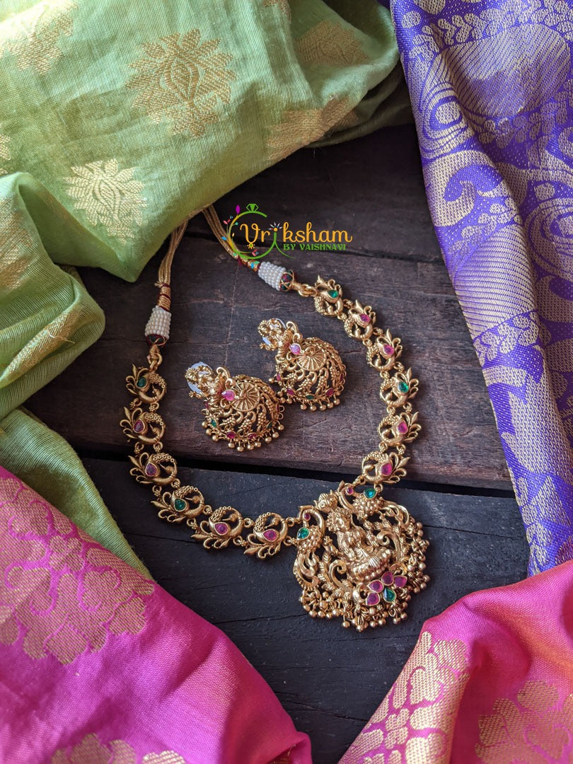 Lakshmi Pendant Short neckpiece - simple temple make neckpiece with Centre Lakshmi Pendant and stone studded peacocks along the length of the neckpiece, comes with matching earrings.